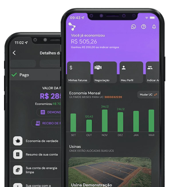 A gente ainda consolida o valor de distribuição da concessionária com o da usina em uma única conta para você pagar, diretamente no nosso app. Assim que chegar a fatura, você vai se surpreender com o desconto e economia.